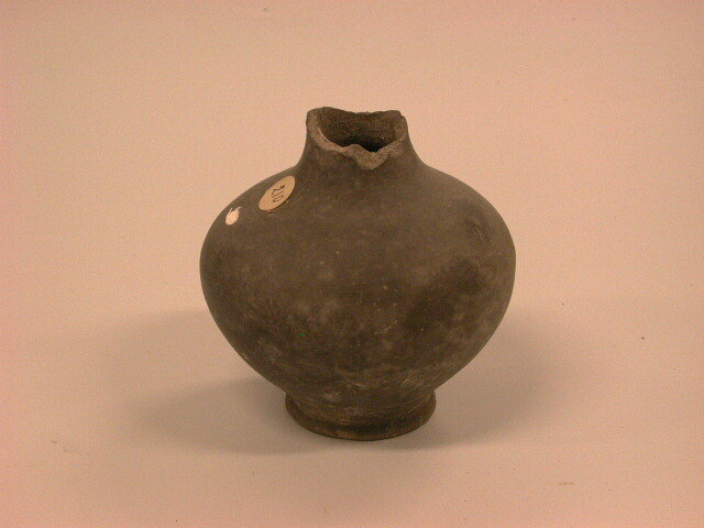 - BeschrijvingFlesje van terra nigra. Voet met standlijn. Grootste omvang ver boven het midden. De buik gaat sterk enger wordend over in de vrij brede hals, waarvan het bovenste gedeelte ontbreekt. Het flesje is vervaardigd van donkergrijze klei, glanzend zwart gepolijst.