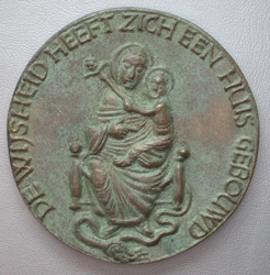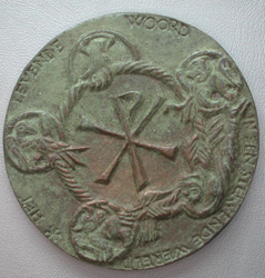 - BeschrijvingVz:Maria als Sedes Sapientiae, de slang vertrappend. Omschrift: DE WIJSHEID HEEFT ZICH EEN HUIS GEBOUWD Kz:Het chi-ro-monogram (naamteken van Christus), omgeven door een krans die gedragen wordt door de hand van de Vader en de symbolen van de vier evangelis¬ten. Omschrift: *HET LEVENDE WOORD IN EEN STERVENDE WERELD