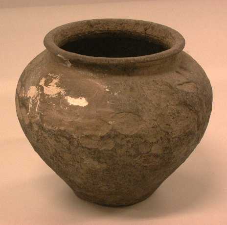 - BeschrijvingKookpot of urn. Ruwwandig, ovaal met ronde rand (omgeslagen) en met bolle schouder. Op de schouder zijn 2 (vinger)deukjes aangebracht. De pot is vervaardigd van donkergrijze klei, gesmoord. Ruwwandig.