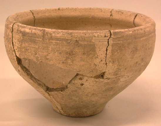 - BeschrijvingRuwwandige kom met smalle voet en een verticale rand, die aan de binnenzijde is verdikt. Langs de rand lopen twee groeven.