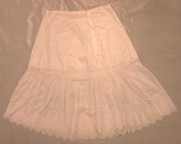 Witte onderrok, heupstuk van fijne katoenen stof, aangerimpelde strook van fijne katoenen batist. De onderrok wordt aan de voorkant gesloten met een split met 2 parelmoeren knoopjes en 2 knoopsgaten. Op de achterzijde kan het middengedeelte gerimpeld worden met een doorgeschoven bandje. Tussen het heupstuk en de strook een entredeux van broderie anglaise. Strook onderlangs versierd met een brede rand machinaal borduurwerk. De rok is aan de achterzijde iets langer dan aan de voorzijde.