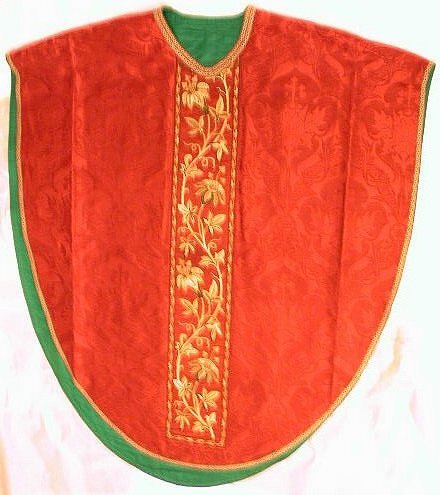 Dalmatiek/tuniek van rode zijden damast met granaatappelmotief, waarbij uit de appels kruizen rijzen. Op de voorkant zijn banden (aurifrisiae) in H-vorm genaaid met geappliqueerde en handgeborduurde passiebloemranken in verschillende tinten oker en bruin. Langs de uiteinden van de mouwen is hetzelfde band gezet. De achterkant is identiek aan de voorkant, zij het iets langer. Aan de voorkant is aan de onderkant van de mouw links en rechts een geborduurde knoop genaaid. Op dezelfde plaatsen aan de achterkant zijn lussen bevestigd. De gehele dalmatiek (tuniek) is afgezet met galon met doornentakkenmotief en heeft een kunstzijden voering in 2 kleuren groen.