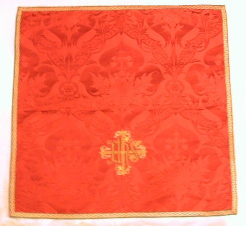 - BeschrijvingKelkvelum van rode zijden damast met okerkleurig borduurwerk voorstellend een versierd kruis met daar doorheen de letters " I H S ". Het velum is afgebiesd met galon met doornentakkenmotief. De voering is van groene kunstzijde.