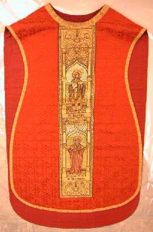 Kazuifel in vioolvorm van rode zijden damast. In de stof herhaalt zich het motief van de franse lelie en 4 dierfiguren. Aurifrisia voor: in het midden een vertikale goudgeel zijden band met in donkerrood ingeweven en later gedeeltelijk in platsteel in bonte kleuren overgeborduurde nissen met heiligen. Onder de bovenste nis een dwarsbalk met de naam "St. Augustinus" en onder de onderste de naam "St. Hieronymus". Achter: band als voor in kruisvorm opgenaaid. Hier zijn alleen de heiligen en engelen overgeborduurd. Op de vertikale balk: een nis waarin Christus met het onderschrift: "Salvator Mundi", een nis met heilige waaronder de naam "St. Ambrosius" en een met "St. Gregorius M.". Op de horizontale balk links een engel met rood gewaad, een banderol dragend met de tekst: "Ego sum via,". Rechts een engel met groen gewaad een banderol dragend met de tekst: "et veritas, et vita!". Het gehele kazuifel is afgebiesd met goudgeel galon (langs de hals een bredere versie) en gevoerd met katoenen satinet in 2 kleuren rood.