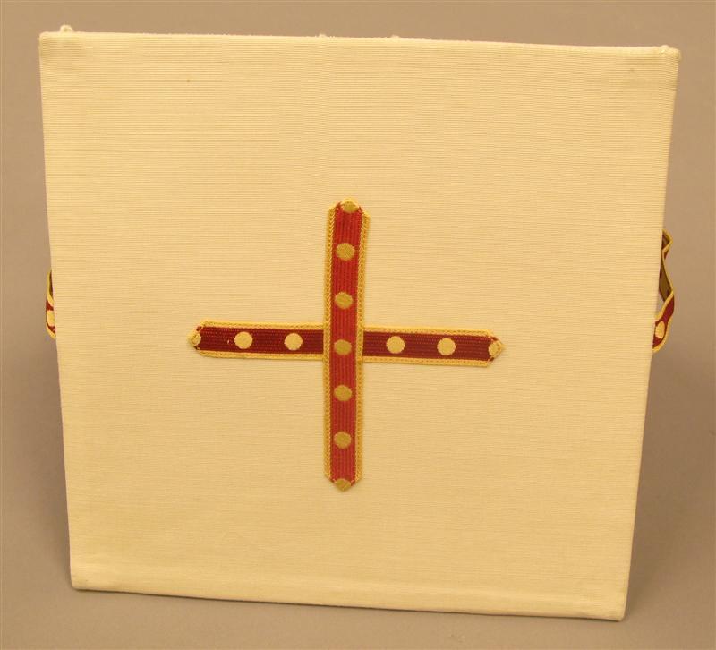 Bursa bovenblad: witte ribkunstzijde gevoerd met wit linnen. Er is een kruis opgenaaid van rood synthetisch band met goudgele randen en noppen. Het onderblad is van witte ribkunstzijde gevoerd met wit linnen. Boven en onderblad zijn aan een zijde met elkaar verbonden door 4 trensjes. De zijkanten zijn verbonden door 2 bandjes (identiek aan het band voor het kruis).