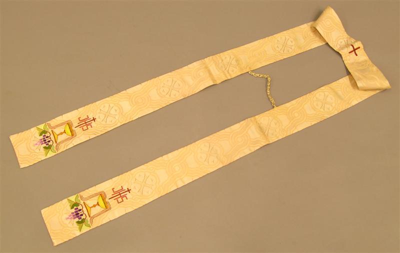 Stola van zalmkleurige kunstzijden damast. In het midden een met rood en groen garen geborduurd kruisje. Aan beide uiteinden in verschillende tinten rood, geel, bruin, groen en paars borduurwerk in platsteek. Voorstelling: Kelk waaruit stralen wijn. Erboven " J H S " met door de H een kruis. Eronder een wijnrank met een tros druiven en 2 bladeren. De stola is gevoerd met gele katoenen satinet. Beide uiteinden van de stola zijn op een hoogte van 63 cm met elkaar verbonden door een geknoopt koordje van wit en goud draad.
