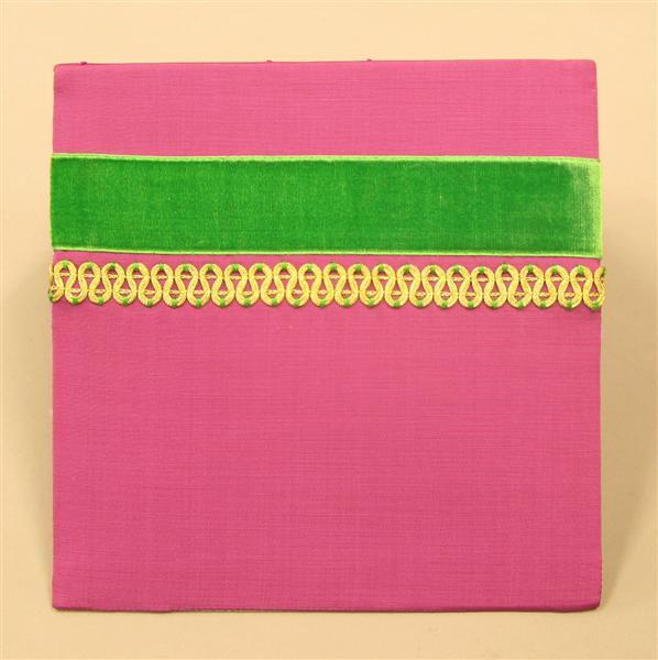 Bursa bovenblad: paarse ribkunstzijde met opgenaaid band. Op 3,5 cm van bovenrand een groen fluwelen bandje van 3,5 cm breed. Daaronder goudgalon met slingerdraad, opgenaaid met groen garen. Gevoerd met wit linnen. Onderblad van paarse synthetische keperstof, gevoerd met wit linnen. Boven- en onderblad zijn aan een zijde met elkaar verbonden door vier paarse trensjes. Aan beide zijkanten is een paars lintje met moiré-effekt genaaid.