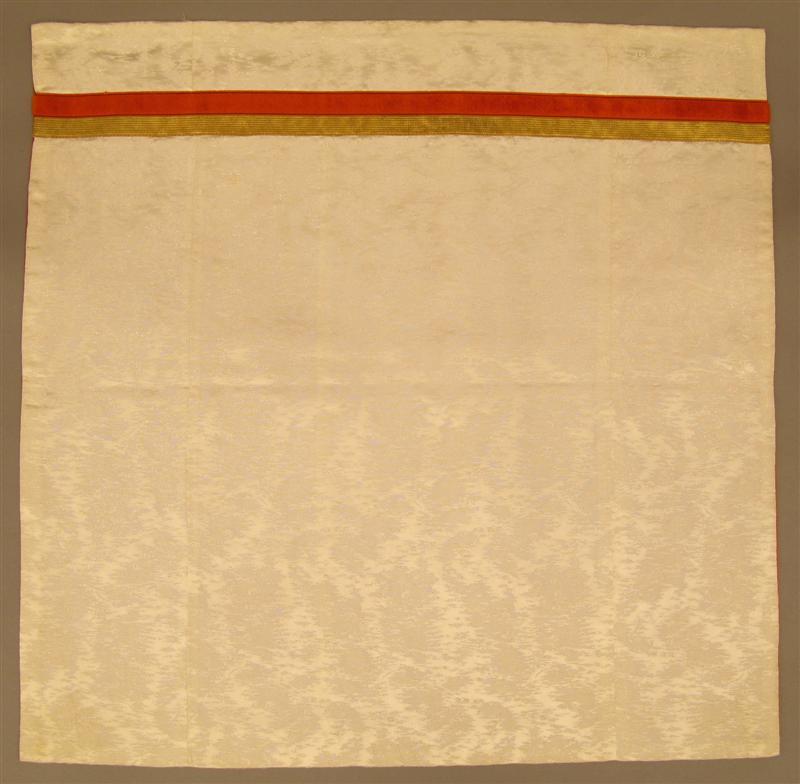 - BeschrijvingKelkvelum van witte kunstzijde ribstof met ingeweven fantasiepatroon. Op 5,5 cm van de onderkant is band opgenaaid. Het band bestaat uit 2 randen: oranje fluweel met daarnaast een rand van goudgeel garen met gouddraad doorweven. Het velum is gevoerd met donkeroranje keperstof van kunstzijde.