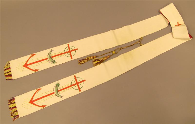 Stola van witte ribkunstzijde. Aan beide uiteinden borduurwerk in rood, goud, wit en verschillende tinten groen en paars. Voorstelling: een ankerkruis, waarvoor een vis en waarachter een nimbus met stralen naar beneden. In het midden een rood kruisje, afgezet met gouddraad. Stola aan beide onderkanten afgezet met franje in donkerrood, rood en geel. Gevoerd met rode kunstzijde. Op 76 cm van onderkant en in het midden 2 gefestonneerde ringen waardoor een koord. Koord in goudgele en donkerrode kunstzijde, samengehouden door een gevlochten ring en aan 2 zijden beƫindigd door een kwast van passementwerk in goudgeel en donkerrood.