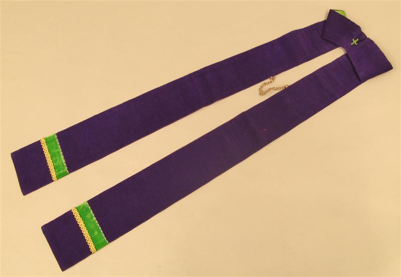 Stola van paarse katoenen ribfluweel. Op 9 cm van beide uiteinden is met paars katoenen garen goudband opgenaaid. Daarboven is een groen fluwelen band van 3.5 cm gezet. Dit band is aan de bovenzijde met paarse kruissteekjes op de stola gehecht. In het midden is met groen garen in kruissteek een kruisje geborduurd. Op 72 cm afstand van beide onderkanten zijn omgefestonneerde ringetjes gezet. Tussen de 2 ringetjes is een koord in goud en paars knoopwerk aangebracht. De stola is gevoerd met groene katoenen satinet.