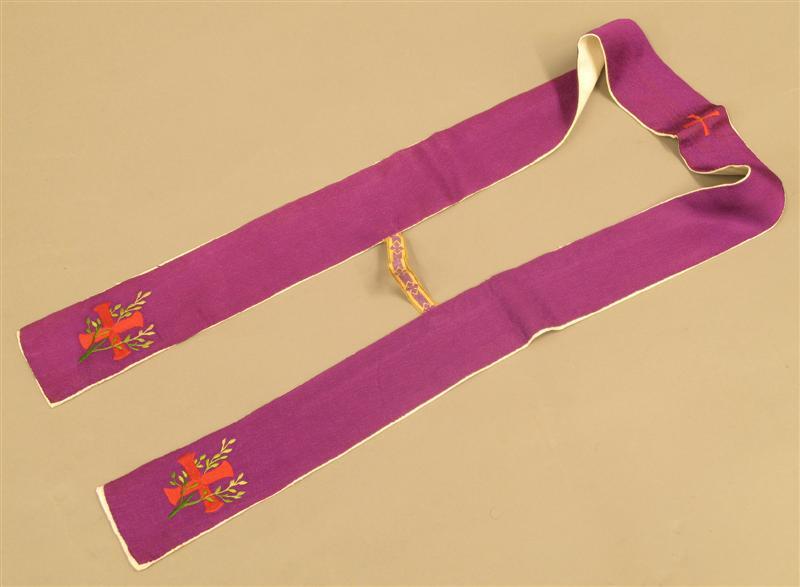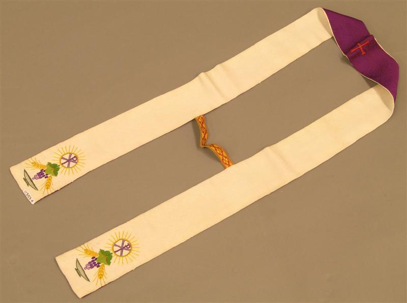 Tweezijdig te gebruiken zakstola van paarse en witte kunstzijde met crepe-achtig uiterlijk. Wordt gedragen bij het bedienen van zieken en stervenden. Paars zichtbaar bij de biecht, wit zichtbaar bij de communie. Paarse kant: op uiteinden is met rood garen een kruis geborduurd waarover een tak in de kleuren licht tot donkergroen. In het midden een kruisje in rood en groen borduurwerk. Witte kant: op uiteinden is in verschillende tinten geel, groen, paars en bruin een schaal geborduurd waarboven een tros druiven met blad en 2 korenaren. Boven het blad een monogram (X met P) in een stralennimbus. In het midden een kruisje in licht en donkerpaars borduurwerk. Op 28 cm afstand van de beide onderkanten zijn de slippen met elkaar verbonden door 2 op elkaar genaaide bandjes. Aan de witte kant een bandje met geometrische motieven in rood op een goudgele ondergrond. Aan de paarse kant een bandje met paars kruis en streepmotief op goudgele ondergrond.