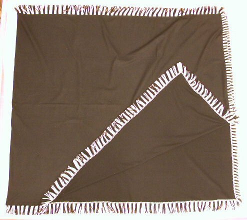 Baarkleed van zwart wollen laken. Omzoomd door franje van zwarte wol afgewisseld met witte.