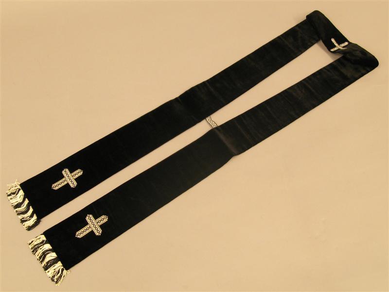Stola van zwarte katoenen fluweel voor gebruik bij rouwdiensten. Op beide uiteinden en in het midden een kruisje van band. Op de uiteinden band van zilverwitte en zwarte kunstzijde met kruisjesmotief. In het midden soortgelijk band met geometrisch patroon. Op 47,5 cm afstand van de onderkant zijn beide slippen verbonden door een bandje zilverwitte en zwarte kunstzijde met kruisjesmotief. Aan beide onderkanten zwart/witte kunstzijden franje. Stola gevoerd met zwarte satinet.