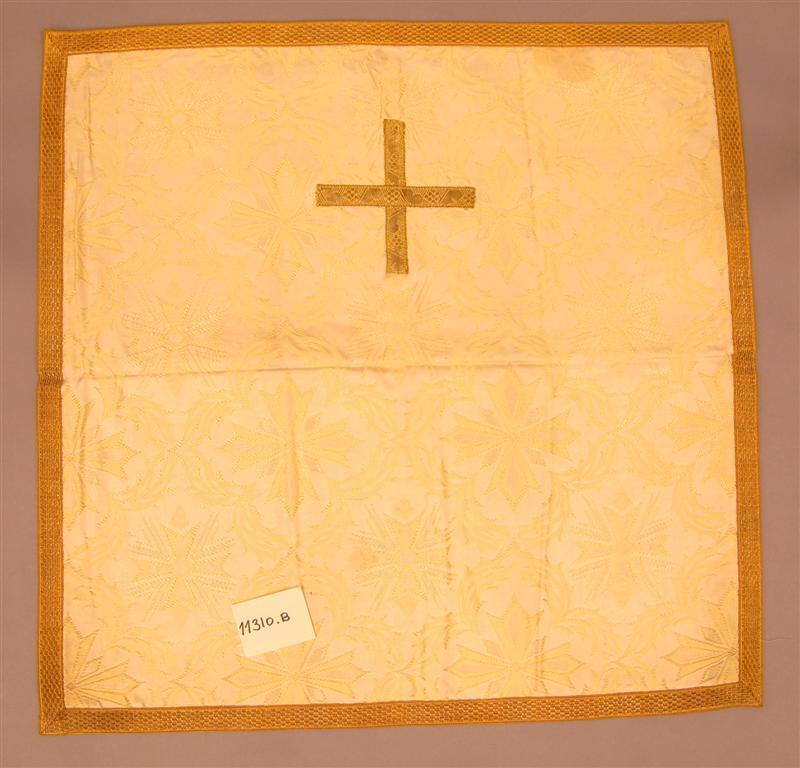 - BeschrijvingKelkvelum van maisgele kunstzijden damast, met een patroon van kruisjes en accolades. Langs de randen is goudband met blokjesmotief gezet. Midden boven de onderrand is een kruisje genaaid van goudgalon met fantasiepatroontje. Het velum is gevoerd met gele katoenen satijn.