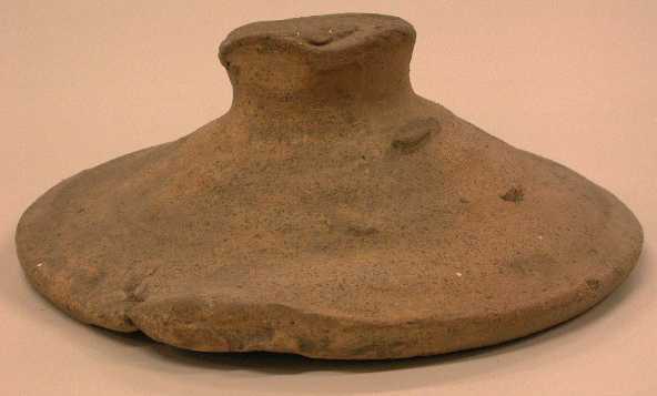 Deksel van ruwwandig aardewerk,geelbruine klei