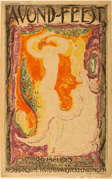 - BeschrijvingAffiche. Opschrift: "AVOND-FEEST/29 : MEI : 1915/ CONCERTGEBOUW.AMSTERDAM VERBOND VAN NEDERLANDSCHE KUNSTENAARSVEREENIGINGEN" (Druk. Senefelder, Amsterdam)