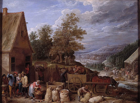 Derde schilderij uit de serie de vier jaargetijden. De herfst wordt aangeduid met de sterrenbeelden weegschaal, schorpioen en boogschutter en door de activiteiten kenmerkend voor het seizoen: plukken van appels (september/herfstmaand), oogsten van druiven en wijnbereiding (oktober/wijnmaand).