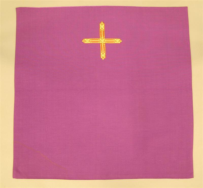 - BeschrijvingKelkvelum van paarse rayon ribstof. Middenonder kruisje van opgenaaid band. Band met kruisjes en streepmotief in bruin en goudkleur. Voering: paarse rayon keperstof.