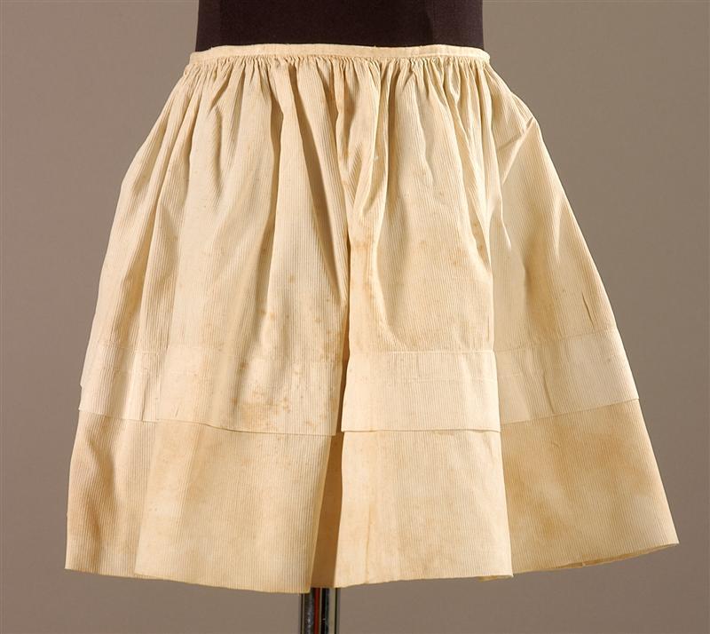 - BeschrijvingRimpelrokje van witte katoenen ribstof. Op 13 cm van de onderkant opnaad van 4 cm breed. Rijgdraad door opnaad. Split middenachter te sluiten met 2 witte, aan het tailleband genaaide bandjes. Trensje onder aan split.