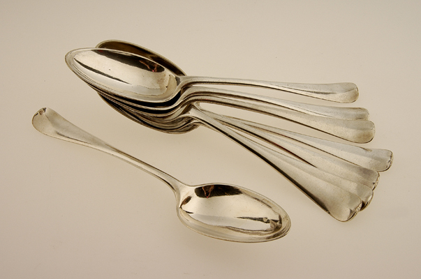 - BeschrijvingAcht grote lepels steeluiteinde sterk omhoog gebogen op opstaand stukje gegraveerde inscriptie: "V.R." Ovale bak, enkel lof. Trembleersteek op achterzijde steel. V.R. zijn de initialen van Victor van Rijckevorsel.