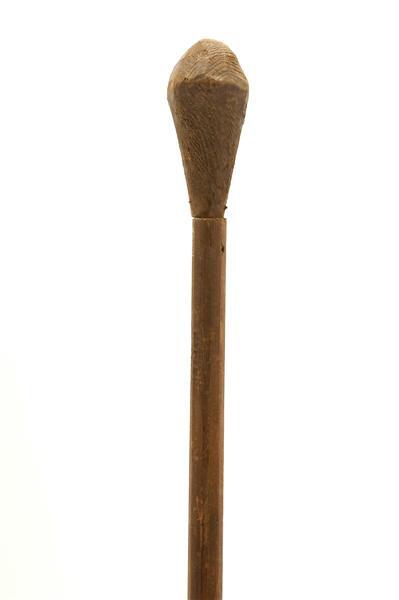 Houten stok, onderaan verzwaard met een uit hout gesneden bal. Op 136.5 cm van boven een metalen schroefhaak.