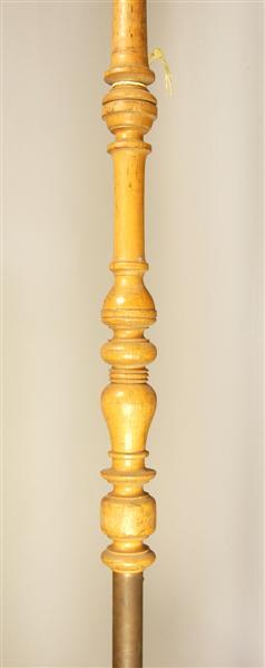 - BeschrijvingDeelbare houten stok, kleurloos gelakt. Het onderste deel van de stok is versierd met draaiwerk. Bovenaan dit stokdeel een koperen huls van 20 cm lengte met een "slot" voor de vergrendeling van het tweede stokdeel. Het tweede stokdeel is aan de bovenzijde over een lengte van 30 cm iets dunner. Op 7.5 cm van de bovenkant bevindt zich een gat in de stok.