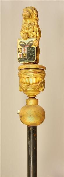 - BeschrijvingVan de scherpschuttersvereniging der dienstdoende schutterij, 's-Hertogenbosch. Zwarte houten stok met verguld houten bekroning = bol waarop rechte rand. Daarboven sokkel met gestyleerd bladornament (o.a. 2 slingers van bladeren). Daarop op ronde voet staande leeuw met in de voorpoten het in kleuren ingeschilderde wapen van 's-Hertogenbosch.