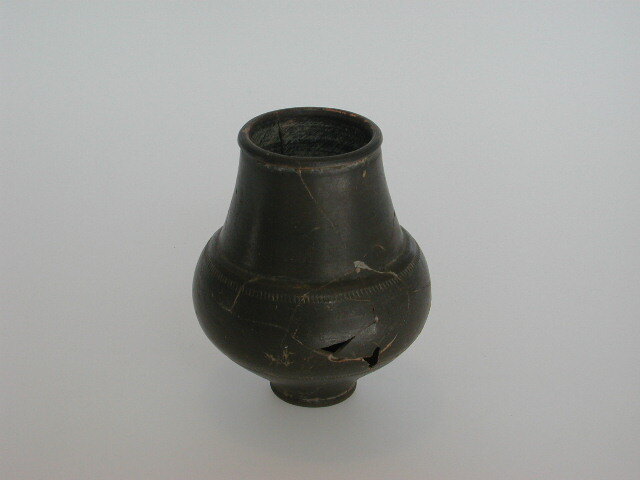 - BeschrijvingBekertje met hoge hals van hardgebakken rood aardewerk, mat zwart beschilderd met gearceerde banden. Volgens Van Hoek helder glanzend.