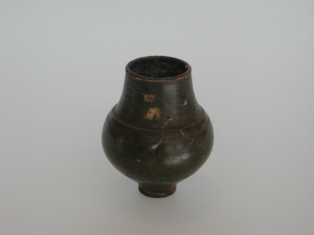 - BeschrijvingBekertje met hoge hals, hardgebakken rood aardewerk, helder glanzend, mat zwart beschilderd met gearceerde banden.