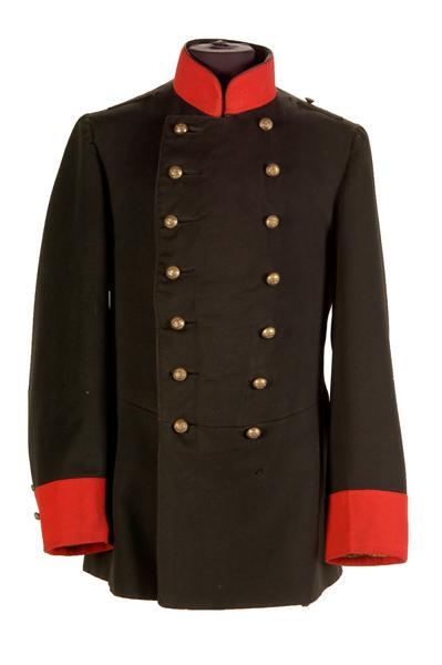 Model 11 maart 1869, waarschijnlijk voor 1e luitenant. Uniformjas van donkerblauw laken. Kraag en mouwopslagen van rood laken. Kraag sluit met haak en oog. Sluiting jas met 2 rijen van 7 gebombeerde metalen knopen met stedekroon en 7 knoopsgaten. Achter alle knopen koperen tegenknoopjes met het randschrift "RODERKERCKEN & KEYZER". Op elke mouw 2 knoopjes met stedekroon, klein model. Op beide schouders een sleuf van laken en trensjes ter bevestiging van de schouderpassanten. Op de linkerschouder een donkerblauw stofknoopje. Split en kleppen op achterpand afgezet met wit laken. Op iedere klep 3 metalen uniformknopen met stedekroon (groot). Voering lijf en schoot: zwarte satinet. Voorpanden en gedeelte achterpand gepiqueerd. Mouwen gevoerd met witte gestreepte katoenen satijn. Op het beleg 2 schuin opgezette steekzakjes van laken. Op schoot linker voorpand een binnenzakje. 2 binnenzakken achter de kleppen. Rode leren band ingenaaid op taillehoogte aan de binnenzijde.