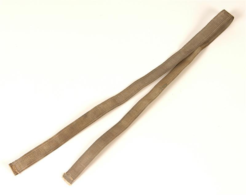 - BeschrijvingBand van metaaldraad in ribbinding met langs beide zijden een geblokt randje. Beide uiteinden aan elkaar genaaid. Past bij sjako 24 aug. 1865.