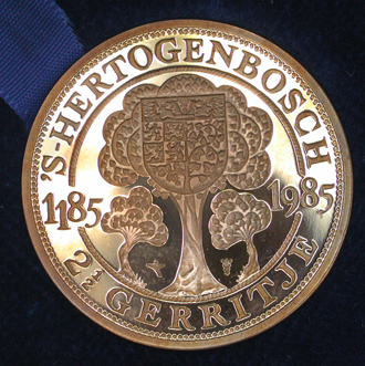 - BeschrijvingEen van de vier Bossche duiten geslagen in 1984 ter herdenking van het 800-jarig bestaan van 's-Hertogenbosch in 1985 en uitgebracht door de Verenigde Bankiers te 's-Hertogenbosch. Voorzijde: De Marskramer, naar J. Bosch. Keerzijde: Combinatie van het oudste stadszegel van Den Bosch en het huidige stadswapen.