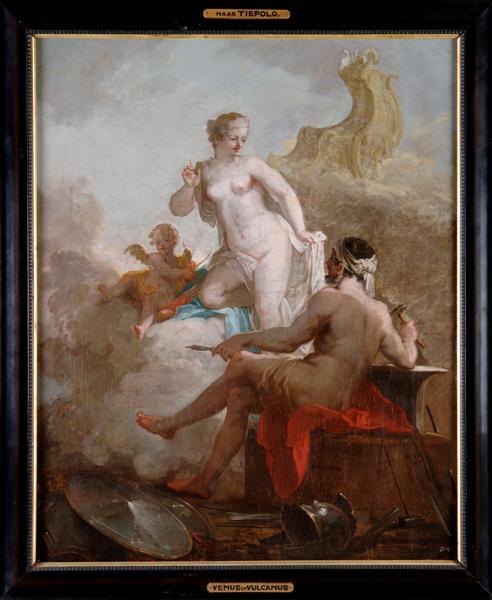 Homeros verhaalt in zijn Ilias over de Godin Thetis. Zij was naar de smidse van Vulcanis afgedaald om de God van het vuur en de metaalbewerking te vragen een wapenuitrusting voor haar sterfelijke zoon Achillis te smeden. Vergillius vertelt in zijn Aeneas dat Venus, de echtgenote van Vulcanus, haar man tot spoed maant met de woorden: "wij moeten wapens voor een geducht krijgsman maken, haast u zonder dralen". Dit laatste moment is hier afgebeeld. Venus is zojuist uit haar zwanenwagen in de werkplaats van Vulcanus neergedaald. Als Godin van de liefde wordt zij vergezeld door Cupido. Vulcanus legt de laatste hand aan de wapenuitrusting. R.o. op schilderij: no. 40 (oud inventarisnummer gemeente Den Bosch). M.o. op lijst: Venus en Vulcanus. Boven: 'naar Tiepolo'