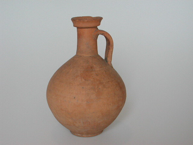 - BeschrijvingKruik met bolronde buik, waarvan de grootste diameter beneden het midden van de buikhoogte ligt. Van schrale lichtrode klei, gladwandig. Scherpe lipvorm.