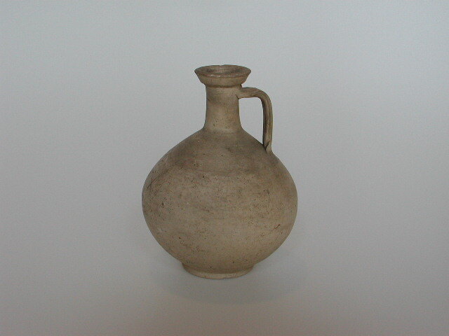 - BeschrijvingKruik, bolle buik, gladwandig. Van witte klei. De grootste omvang ligt op het midden van de buikhoogte.
