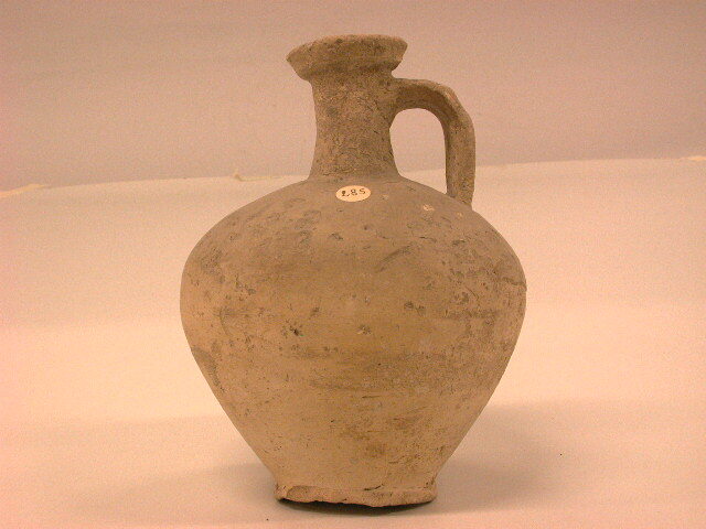 Kruik, gladwandig. Grootste omvang boven het midden van de buikhoogte. Vrij scherpe lipvorm. Vervaardigd van witte klei