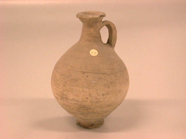 Kruik. Gladwandig. De grootste omvang ligt iets boven het midden van de buikhoogte. Geprofileerde lipvorm. Tweeledig oor. Vervaardigd van witte klei