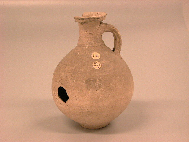 - BeschrijvingKruikje. Rondbuikig, gladwandig. Grootste diameter op het midden van de buik. Wijd uitstekende lip (scherp). Standring ontbreekt. Vervaardigd van wit-rose klei