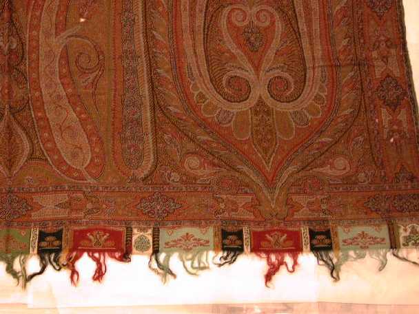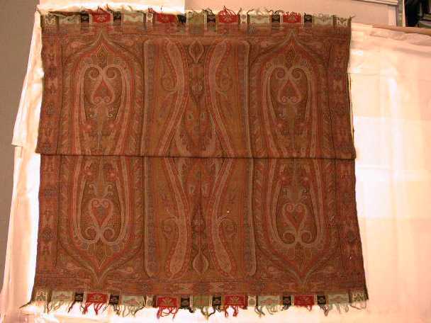 Wollen doek met inslag in de kleuren wit, zwart, turquoise, rood, oranje en groen. Ketting bedrukt, overwegend rood, in de spiegel zwart en ter hoogte van de harlekijnranden in de hoofdkleuren van de mihrabs. Kleine zwarte stervormige spiegel. Grote palmetten in de lengterichting. Smalle omranding met fantasiepatroon. Boven en onder een harlekijnrand. Groene zelfkanten. Franje in de kleuren van de mihrabs gevormd door de kettingdraden en over ca 10 cm vanaf de zelfkanten geknoopt. Grondweefsel in keperbinding.