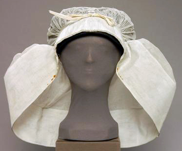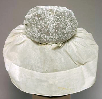 Geplooide voorstrook van een dubbele laag gaas, verstevigd met dun, slap laiton. Schildje, 1 cm breed, van kant op gaas. Bodem van gestopte tule in eenbloems patroon. Geklost laddertje met 2 doorgeschoven katoenen veterbandjes waaraan rechtband. Sluier met brede zoom (9.7 cm) van gaas. Zoom onderaan verstevigd met laiton (?). Onder de voorstrook, op de zoom van de sluier, aan beide zijden een smal strookje tule verstevigd met laiton.