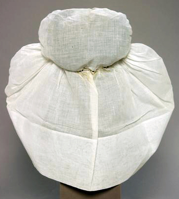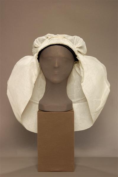 - BeschrijvingRouwmuts (of daagse muts?). Geplooide voorstrook van dubbel neteldoek, verstevigd met dun, slap laiton. Smal schildje (ca 0.8 cm) van een dubbele laag neteldoek. Bodem en sluier neteldoek. Geklost laddertje waardoor 2 witte katoenen veterbandjes geschoven zijn. Zoom sluier 13 cm breed. Zoom onder voorstrook langs voorkant verstevigd met strookjes tule en laiton.