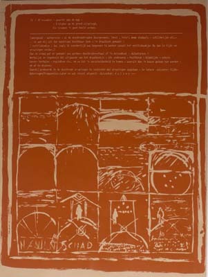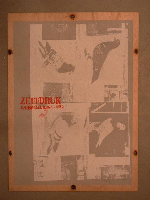 - BeschrijvingMap met zes bladen zeefdrukken in een omslag, nr. 58. Map: houten voor- en achterkant, met linten bijeen gebonden. De buitenkant beschilderd en bedrukt, o.a. met: 'JAN DE BIE/DOOIBROEK-EN DUIVEN(HOK) REGISTRATIES'. Omslag: bedrukt met voorstellingen en tekst betreffende het werkproces aan 'dooibroek'. Bladen grafiek: in tweeën gevouwen, de binnenzijde bedrukt, de buitenzijde beschilderd.