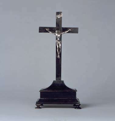 - BeschrijvingHouten kruis met corpus van verzilverd koper (9.5 x 8 cm) met korte lendendoek daarboven een horizontale banderol, eveneens verzilverd koper waarop "INRI". Houten voet, rechthoekig op vier pootjes.