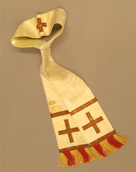 Manipel van witte zijden damast. Het patroon bestaat uit cirkels waarin een kruisje. Versierd met smal band, bordeaux-rood met goud, in de vorm van 2 kruisjes en een streep. Zijden franje in rood en maiskleur. De strook is in de lengte dubbelgevouwen en op 21 cm van de bovenzijde zijn voor- en achterkant aan elkaar genaaid. Voering van crèmekleurige kunstzijde. In 1986 ingeschreven.