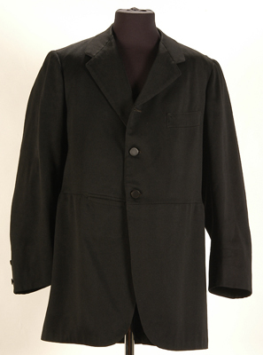 - BeschrijvingZwart wollen jasje, middenvoor gesloten met 3 knopen en knoopsgaten. Borstzakje in linker voorpand. Steekzakje in taillenaad van rechter voorpand. Rond weggesneden voorpanden. Mouwen met 2 knoopjes. Split middenachter met aan beide zijden een knoopje. Satijn voering.