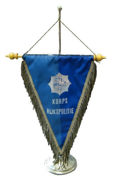 Driehoekig blauw vaantje, gehangen aan een standaard. Vaantje: beschilderde stof, langs de 2 lange zijden afgezet met zilverfranje. Rechter helft lichtblauw, linker helft donkerblauw. In het midden een opdruk in zilver met het vignet van het Korps, daaronder in kapitalen "KORPS RIJKSPOLITIE". Voering witte rayon.Aan de bovenzijde een doorgeschoven houten stokje met gedraaide knopjes. Het vaantje is met een zilverkoord aan een metalen standaard gehangen. De standaard bestaat uit een ronde voet met opgeschroefd buisje. Bovenop het buisje een bolletje, daaronder een haakje.