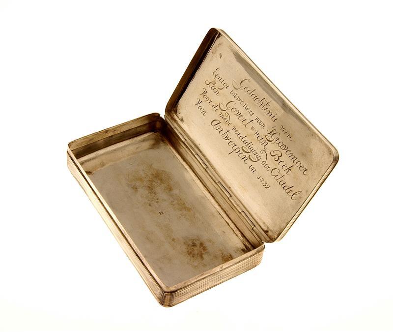- BeschrijvingGeribde tabaksdoos met scharnierend deksel. Aan de binnenzijde van het deksel is gegraveerd: "Gedachtenis van/Eenige inwoners van 'S/Gravemoer/Aan Govert van Beek/Voor de mede verdediging der Citadel/van Antwerpen in 1832". De tabaksdoos werd op 11 september 1833 te 's-Gravenmoer overhandigd aan Govert van Beek door ds. C.S. Welle.