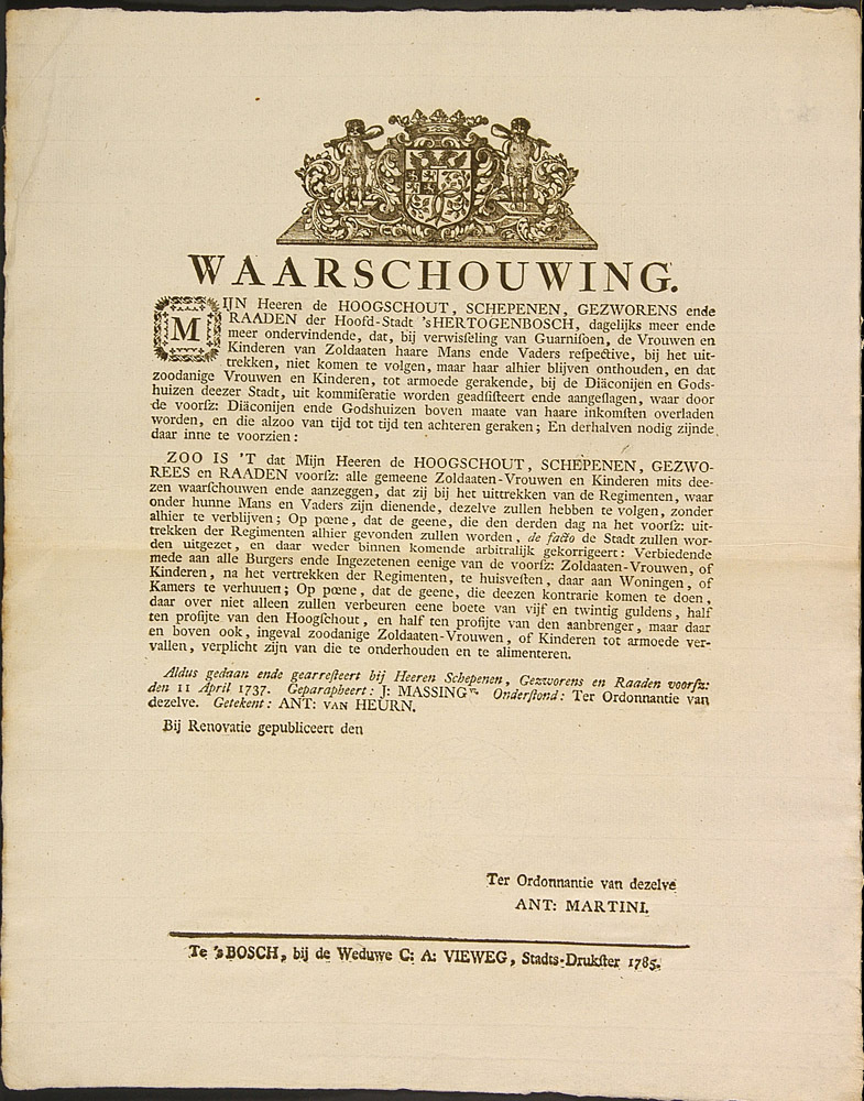 - BeschrijvingPublikatie van schepenen, gezworenen en raden van 's-Hertogenbosch tegen het achterblijven van soldatenvrouwen en soldatenkinderen.