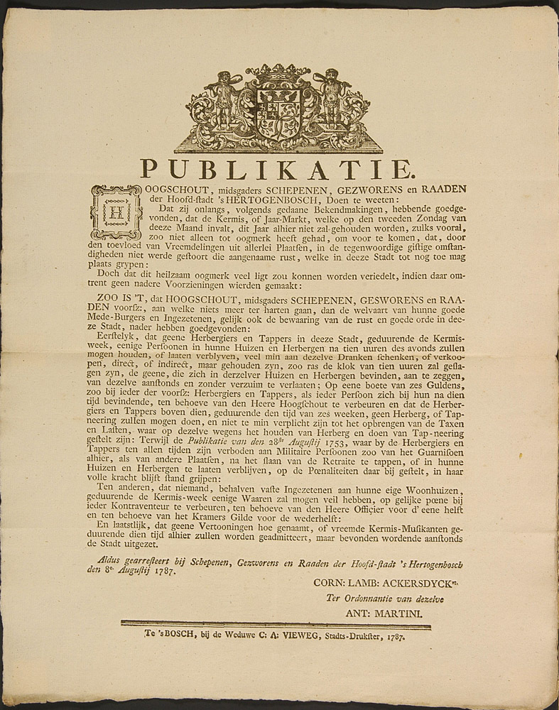 - BeschrijvingPublikatie van schepenen, gezworenen en raden van 's-Hertogenbosch met bepalingen over het vieren van de kermis.