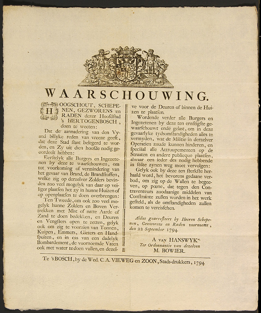 - BeschrijvingPublikatie van de schepenen, gezworenen en raden van 's-Hertogenbosch met aanwijzingen voor de burgerij betreffende het beleg.